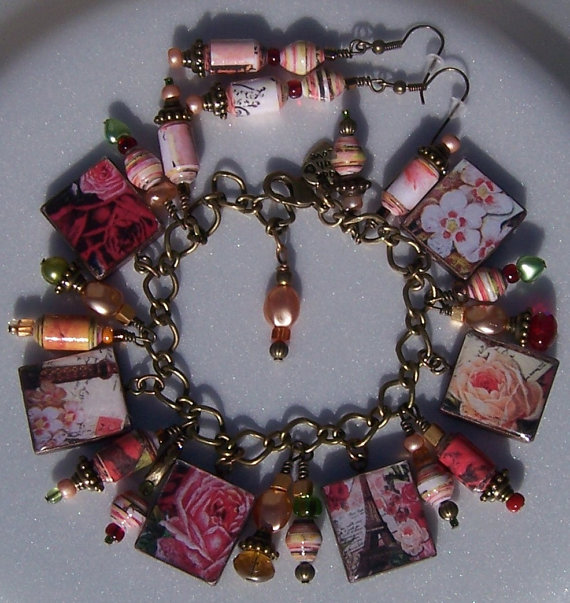 Dee takes photos of plants and nature and turning them into beautiful paper beads. She has a library of prints with varying subjects mostly nature and flowers. This is one example of Dee’s creation, The Scrabble Charm Bracelet, hop on to her etsy site and see how she made this one.