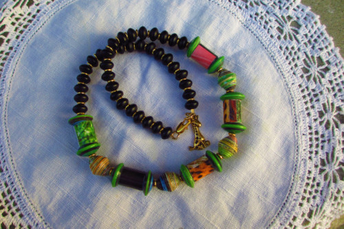 Have I told you about my new Jewelry line? Zooviewtiful Jewelry! What are they? The beads are cut and rolled from the L.A. Zoo Magazine, published quarterly by the L.A. Zoo. Portion of sales goes to the L.A. Zoo. This Zooviewtiful Necklace is just perfect for animal lovers out there. Here it is up close and personal:)