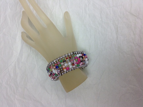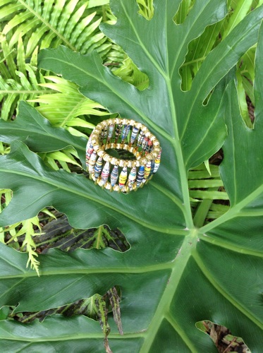 Another bracelet using safety pins, this time in gold. Love the gold and paper beads together.