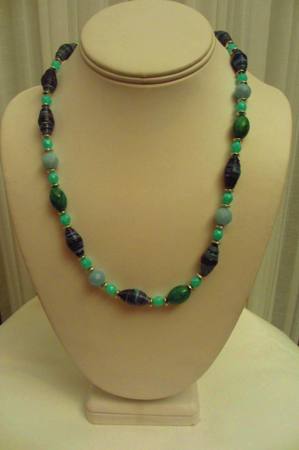 The beads in this necklace are made from a pull out sheet of National Geographic commemorating the sinking of the Titanic. As you can see the colors are that of the deep blue ocean, beautiful and scary at the same time. I mixed amazonite and turquoise beads to accent the deep blue of the paper beads. But first, here’s a basic beading how-to: