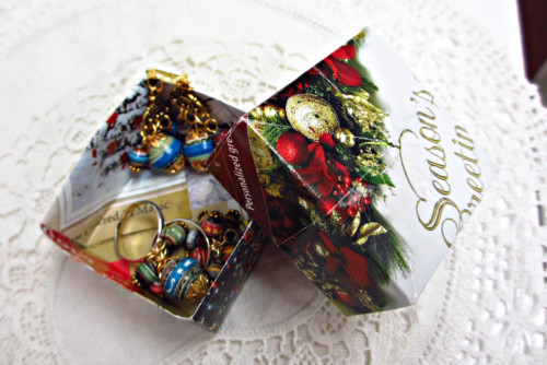 These pair of earrings is the perfect companion to the Cha-cha ring I made the other day. The big round middle bead has this perfect blue that goes so well with gold color. Paper bead presents need to be in a recycled gift box as well don’t you think?